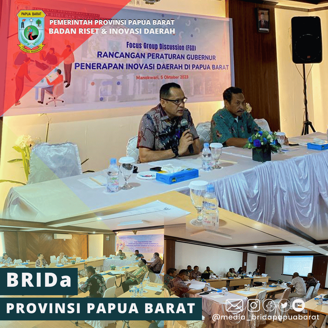 BridaNews_MANOKWARI – Sebagai salah satu tupoksi terkait inovasi daerah, Badan Riset dan Inovasi Daerah (BRIDA) Provinsi Papua Barat melakukan Focus Group Discussion (FGD) draft Rancangan Peraturan Gubernur (Ranpergub) Provinsi Papua Barat tentang Penerapan Inovasi Daerah Tahun 2023 di Mansinam Beach Hotel, Manokwari, Kamis 05 Oktober 2023.