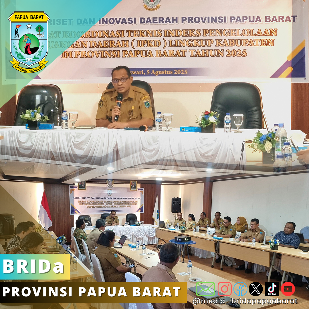 BridaNews_Manokwari,- Badan Riset dan Inovasi Daerah Provinsi Papua Barat menggelar Rapat Koordinasi Teknis Penginputan data Indeks Pengelolaan Keuangan Daerah (IPKD) Tahun 2025 bagi Kabupaten se-Provinsi Papua Barat yang dilaksanakan di Mansinam Beach Hotel Manokwari pada Selasa, 5 Agustus 2025.