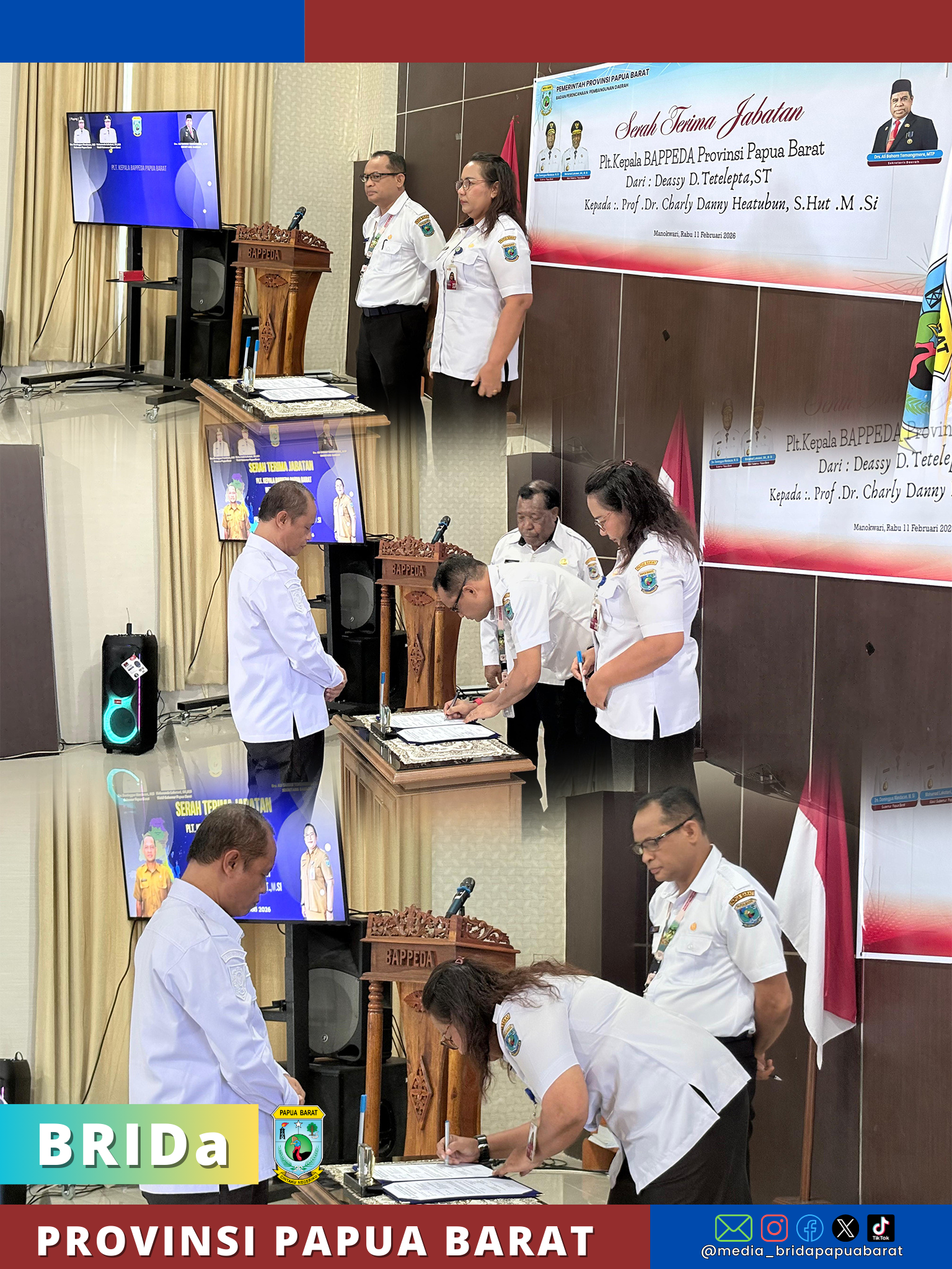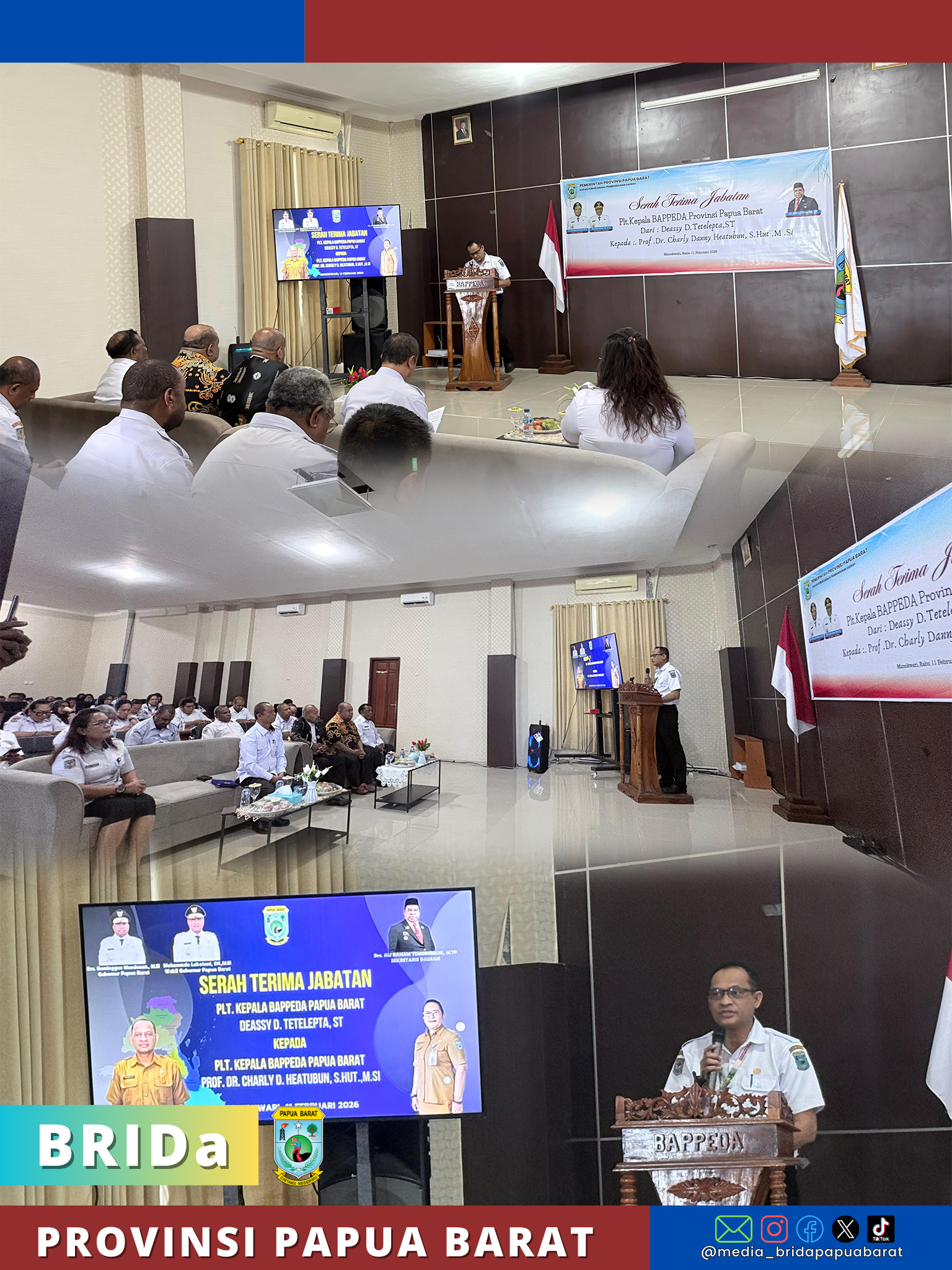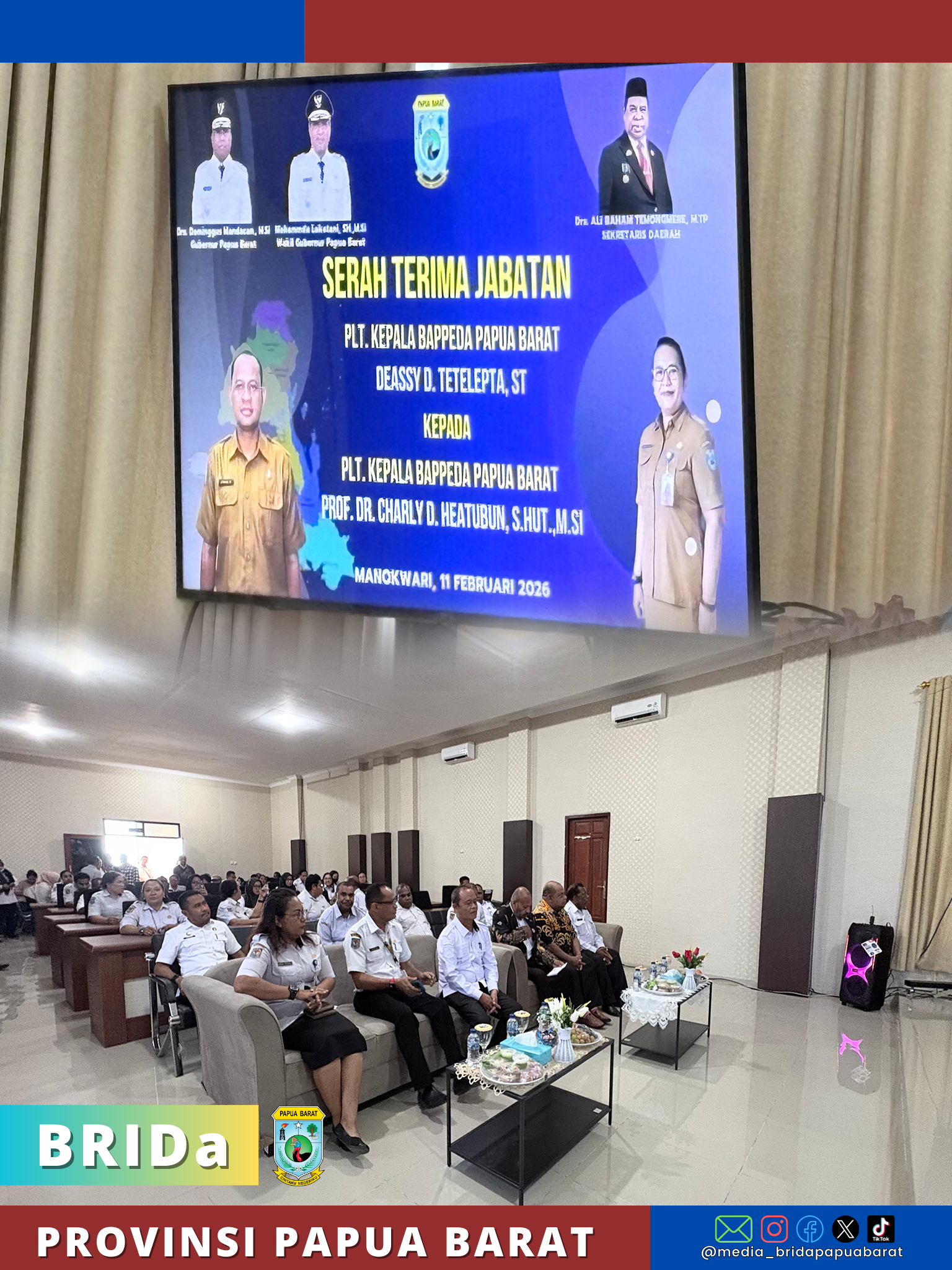 BridaNews_Manokwari, Pemerintah Provinsi Papua Barat melaksanakan serah terima jabatan Pelaksana Tugas (Plt) Kepala Badan Perencanaan dan Pembangunan Daerah (BAPPEDA) Provinsi Papua Barat kepada Prof. Dr. Charlie D. Heatubun, S.Hut, M.Si dalam prosesi resmi yang berlangsung di Aula Kantor BAPPEDA Provinsi Papua Barat. Rabu (11/2/2026)